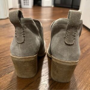 FEATURES: 3" stacked angled heel - slip on gray / greige taupe suede leather upper