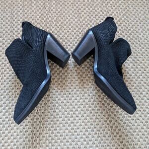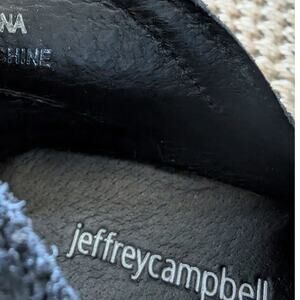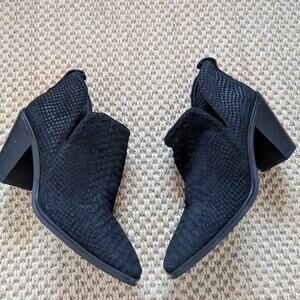 Jeffrey Campbell Rosee Black Suede Snake Print Ankle Boots. Women’s Size 10. Square toe. Slip on. Tulip-cut topline with cutouts at sides. Pull tab at heel. Approximate 3.5" stacked high heel. Suede upper, leather and fabric lining, synthetic sole.