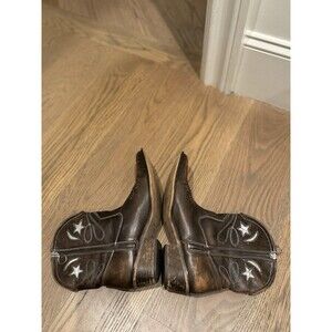 Iconic early-2010s Jeffrey Campbell Starwood cowboy ankle boots in the ultra-coveted distressed brown leather with metallic silver star & crescent moon inlays and white contrast stitching. These were an instant cult classic the day they dropped and have been discontinued for almost a decade this exact colorway almost never shows up anymore.