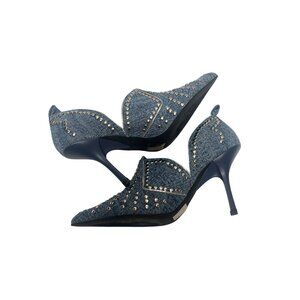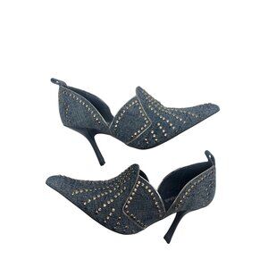Elevate your style with these eye-catching Jeffrey Campbell stiletto heels. Perfect for a night out, these shoes feature a spangled denim finish adorned with silver studs. Combine comfort and high fashion effortlessly. Excellent preowned condition!