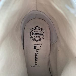Gently used size 8 Jeffrey Campbell Lita Booties. I bought these used but never wore them myself for they are too big for me. White leather with silver spikes along the heel. No tears, however there are some very small indentations in leather from poorly storing the shoes (the spikes of one heel got pressed up against the leather of the other shoe, causing small indentations). Does not come in original box.