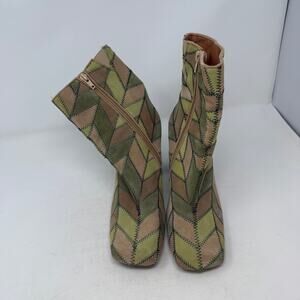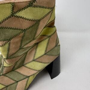 Unique Jeffrey Campbell ankle boots featuring geometric patchwork suede in earthy tones of green, beige, and tan. Designed with contrast zig-zag stitching and a bold block heel, these boots combine retro-inspired style with modern edge. A standout statement shoe for any wardrobe.