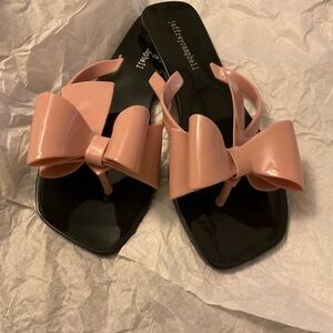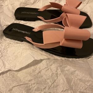 Jeffrey Campbell Sugary Thong Jelly Sandals, featuring a large bow in blush and black shiny finish. These stylish sandals in size 7 are perfect for adding a touch of whimsy to your summer wardrobe. New has a mark on one sandal look at pictures for details NWOT