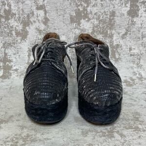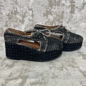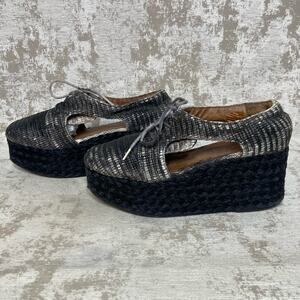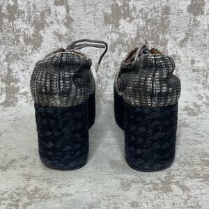Fantastic platform from Jeffrey Campbell! Features lace up style called "Tahiti Last", woven raffia exterior, black to creme ombre throughout, runner sole, round toe, black espadrille heel, and side cutouts.