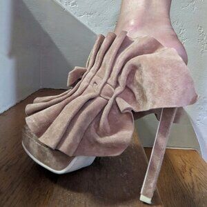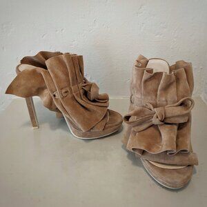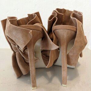 A fabulous pair of Jeffrey Campbells, the softest possible tan suede covers the front of your foot in a beautiful gathered effect, an absolute conversation piece! These are gorgeous on, will elevate any of your cocktail or event dresses and can be worn spring, summer & fall.