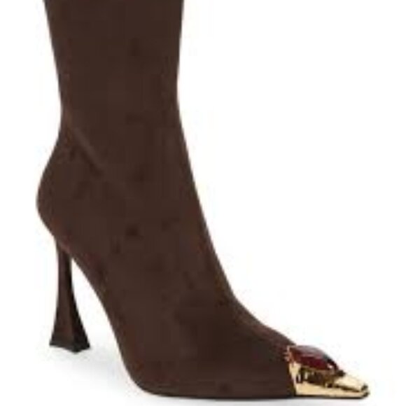 A tortoiseshell-patterned jewel shines atop the metallic snip toe on a faux-suede boot designed with a streamlined profile and lifted by a svelte flare heel.