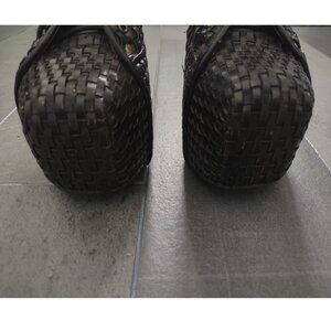 Jeffrey Campbell Lita platform heels. Size 8. Color: black with wood heel. Woven basketweave pattern. Has a little bit of peeling at the top edge (see photos), otherwise in really good condition.