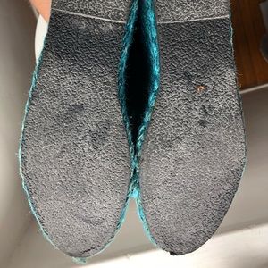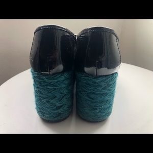Black and white penny loafer platforms with a teal beaded sole. Lightly used, a little bit of fraying at the sole but can be easily cleaned up