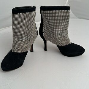 Jeffrey Campbell silver chain mail and black suede platform booties. Some of the chain is a little wonky on the inside left boot but it’s not really noticeable and doesn’t affect wear. Back zipper. Essential funky cool designer style for any evening out adventure. Very good condition. Smoke free home