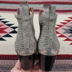 Jeffrey Campbell Cromwell Bootie in Hunt the Plains style, textured Suede Snake feel, Tan Taupe color, western inspired silver Embellishments on toe and heel, deep splits on sides, slip on style.