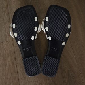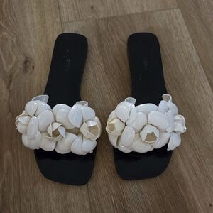 Excellent pre owned condition. Jeffrey Campbell "Floralee" floral jelly slide sandals. These sandals feature a black, square-toed base with a cluster of white, flower-shaped embellishments across the strap. The flowers are made of a jelly or synthetic material, matching the overall construction of the sandal. According to customer reviews, the sandals may run wide and large. They are designed as slip-on sandals with an open toe and a flat rubber sole