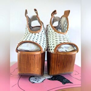 Description: Jeffrey Campbell Kelsey White Tan Wedge Heel 7 Maximalist Hyper Feminine Retro Art To Wear, woven white leather upper with side pull-on tabs, gorgeous sculptural wooden curved heel, minimal wear on the soles, ships with box