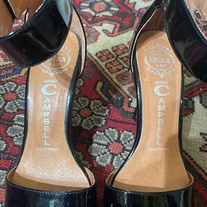 Jeffrey Campbell black patent leather pumps with ankle strap and 3-3.5” heel. Good condition with a few minor scuffs and one scratch in the left heel (pictured).