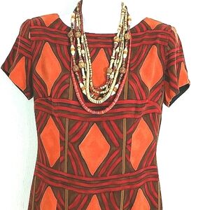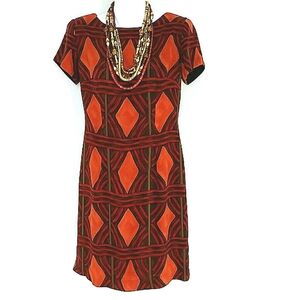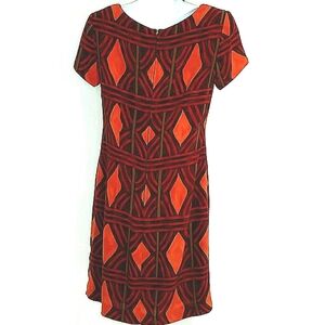 Jeffrey & Dara women’s size 6 short sleeve midi dress in a rich red, orange, and brown geometric print. Features bold diamond shapes reminiscent of Southwestern and Santa Fe patterns. Tailored stretch fit, 33" length, and 17" armpit to armpit. Excellent condition, like new.