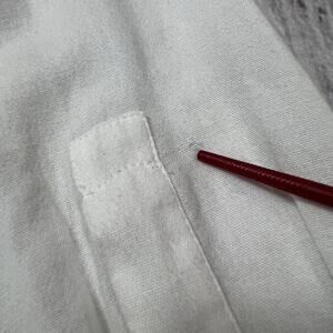 SOME SMALL LIGHT STAINS AND PILLING. SMALL HOLE BY RIGHT SLEEVE PLACKET. PLEASE VIEW PHOTOS FOR DETAILS.