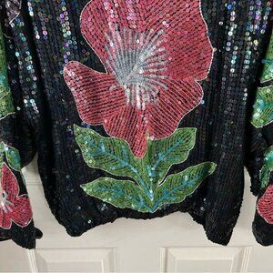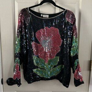 All Over Sequin Floral Blouse - Black / Pink / Green