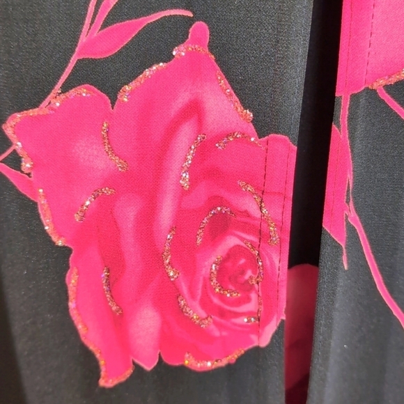 Jeffrey and Dara Evenings 2 piece Open Front Black and Pink Dressy Jacket and shell Size 10P. The jacket has a small, covered button closure. So versatile, pair with black dress pants or skirt. For a summer look pair with all white. Perfect for weddings or formal events. Excellent pre-owned condition with no flaws.