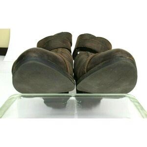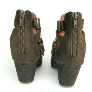 Jefferey Campbell Ibiza Stillwell Booties. Brown Leather. Size 6.5 US.Very good pre-owned condition. No rips, holes, or stains. Comes from smoke free environment.Bronze buckles. Cut leather look. Back Zip Closure. Woven Vamp Detail. Open sides. Stacked Chunky heel with back beveled accent.