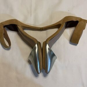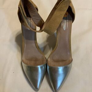 Chic tan suede leather with silver pointed toes. EUC & Smoke free & Pet free home. See ALL photos for complete description/details.