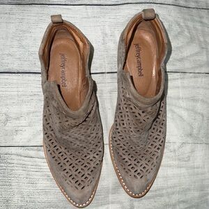 Good, preloved condition. Jeffrey Campbell Taggart Suede Cutout Taupe Cut Out Pointed Western Booties. 1.5 “ heel. Perforated. Leather upper, leather lining, synthetic sole.