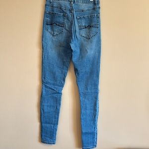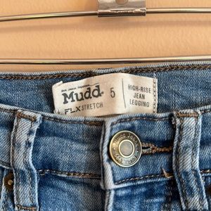 Size 5 light blue jegging. Lightly distressed on back pockets and front legs.