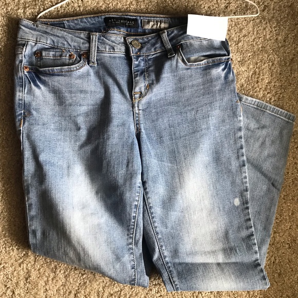 Light wash faded jeans. Small bleach stain. No other noticeable flaws. Jeggings but feels more like jeans. Short size.