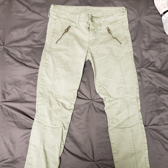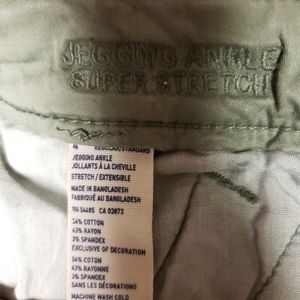 American eagle olive green ankle jeggings. Super comfy! (They are darker in person)