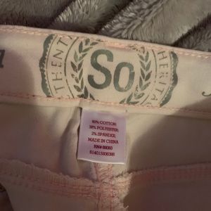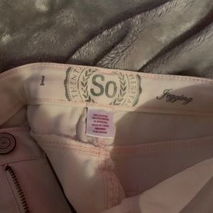 very pale pink high waisted jeggings. if you compare them to the white shelf in the photo, you can see they are only slightly darker. only worn once. in great shape. pet and smoke free home!