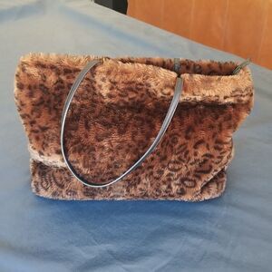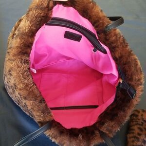 Pretty animal print, with hot pink interior. Perfect for a little get away piece. Zippered interior compartment, and 11" drop on straps. There is a flaw as depicted in the last photo, but it's really hard to pick up in photos, and it's hardly noticeable. C1.554