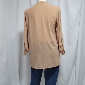 Jella Couture 3/4 sleeve button cuff sheer v-neck beige blouse, size S