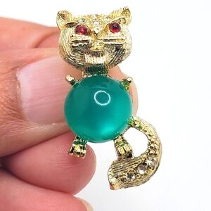 Such a cute cat!! The gold metal setting holds the green moonglow cabochon "belly" of this gold metal attitudinal cat with sparkly red rhinestone eyes. This little cutie has four clear rhinestones on his forehead and three on his tail.