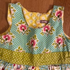 Charming casual dress by Jelly The Pug. Features a blue and yellow pattern with floral accents. Perfect for playful days. In good used condition, no holes or stains.