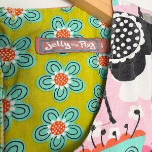 Whimsical and colorful Jelly the Pug tunic top in girls size 8, perfect for any little fashionista! This sleeveless tunic features a bold floral print in shades of pink, teal, black, and white with a fun contrasting green floral inner lining. Designed with a high-low hem—the front is shorter than the back—for added flair and comfort. Black polka dot ruffles at the hem complete this playful look. Great for pairing with leggings or shorts!