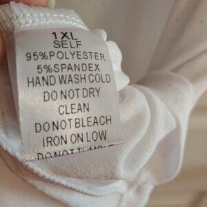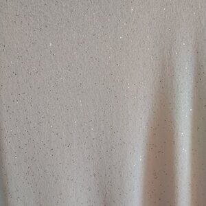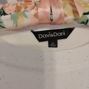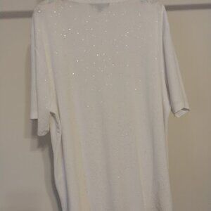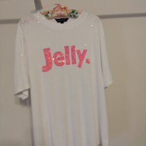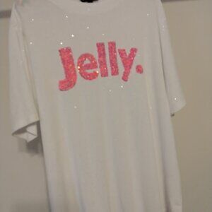 "Jelly" top by Davi & Dani - Size 1X. Short sleeve crew neck top. The white sparky material is soft and flowy with the Jelly logo on front in pink sequins.