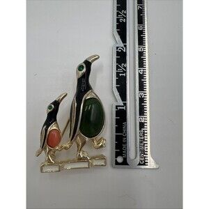 Jellybelly Penguins Marching Pin Brooch Vintage Gold Tone Enameled Real Stone