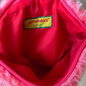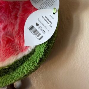 Adorable watermelon plush bag for kids. Features a cute smiley face and soft texture. Perfect for carrying small essentials.