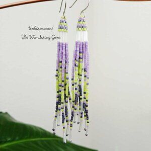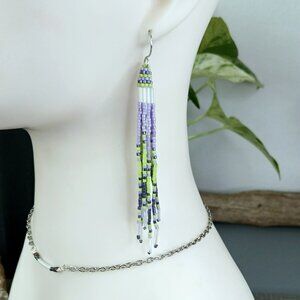 Jellyfish Beaded Fringe Shoulder Duster Dangle Earrings, Purple & Green 4.5"