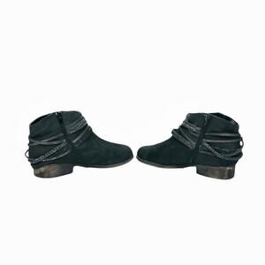 Step up your style with these Jellypop black ankle booties, featuring edgy chain and strap detailing around the ankle. Made with a faux suede upper, these boots offer a soft texture with a slightly distressed finish for a lived-in look. The stacked low heel and cushioned footbed provide all-day comfort, while the side zipper allows for easy on and off. Perfect for pairing with skinny jeans, leggings, or skirts to add a bold, trendy touch to your outfit.