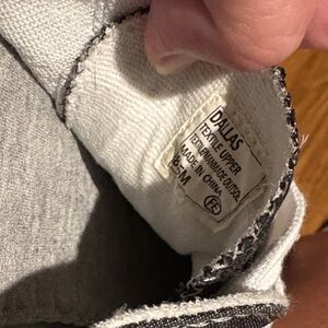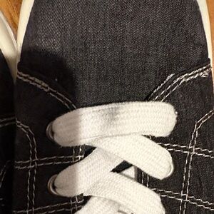 Casual black sneakers with white laces. Comfortable and stylish for everyday wear. They are in like new condition. The only flaw I see is in the laces (see picture). There is a small dark spot. Comes from a smoke free home.