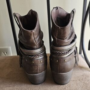 Jellypop stylish brown ankle boots with buckle detail. size 6.5. these have never been worn, but I did cut off the tags. the sticker is still on the bottom.
