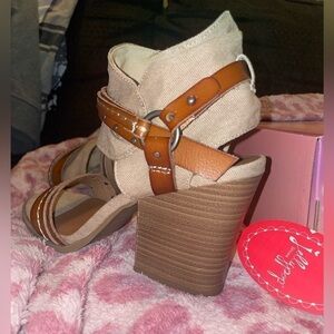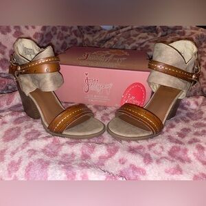 Brand New With Box Jellypop Shannen open toe block heel sandals. Size 8.5 tan canvas and brown leather, with cuff on the quarter strap and gunmetal studded details.