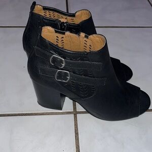 Make a Statement with these Jellypop Logan Open toe Booties. Style them with a pair of jeans or a work attire or A night out…. Man made materials. 3.25” block stacked heel, 4.25” shaft, side zip closure Size 8W in like new Condition