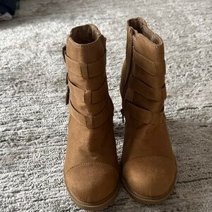 Stylish tan ankle booties with strap details. Perfect for versatile wear.never worn no tags