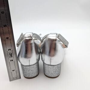 Your fashionable kiddo will love to strut in these metallic dress sandals framed by a glitter-covered block heel and a bow-topped open toe. Hook-and-loop adjustable ankle strap Synthetic upper, lining and sole.