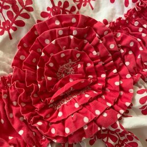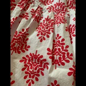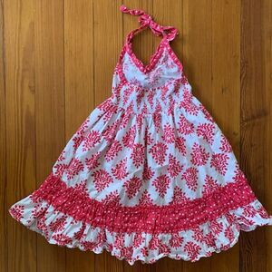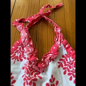 Lightly worn. Pink print/design throughout. Tie at neck.flower detail on front. Size 3T