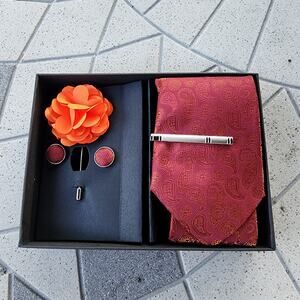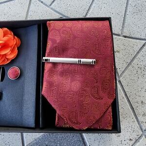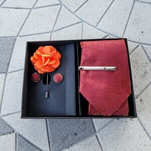 Open Box: Classic, four piece matching gift set- includes: burgundy tie, cufflinks, tie bar clip, & lapel pin.
