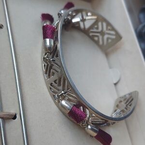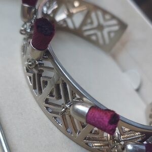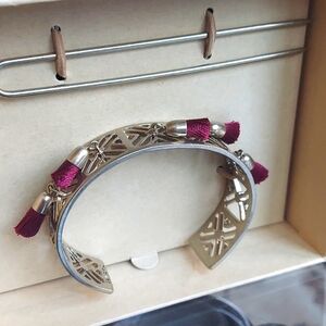 Beautiful antique silver cuff with red tassels. Comes with pin to secure hair. Can be worn multiple ways.