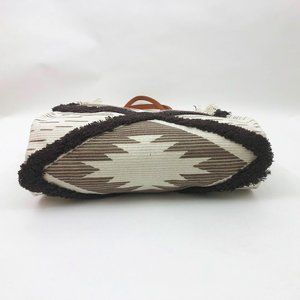 NWT, New With Tags. Jen & Co. Madison handwoven tote/beach gab is eye catching with its' fringe accents. Front & back have black, natural, & charcoal Southwest design. The Carry straps are tan Vegan (faux) leather. The tote closes with a magnetic snap. Inside is another bag with it's own adjustable strap from 11 to 21 inches. This bag has 2 open slip pockets and 1 zipper pocket. This smaller bag closed with a zipper. The Madison is a gorgeous tote bag that is great for everyday use.