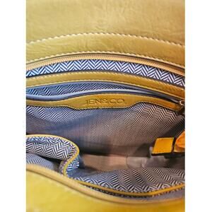 Jen &b Co Vegan Leather Crossbody Bag with Leopard Guitar Adjustable Strap. Length: 12 inches, Height: 11 inches, Depth: 3.5 inches. Atlanta, Georgia. Zipper pocket one side, Large pocket with Snap across front for easy access. Zipper pocket on Label side inside; 2 pockets inside other side. Fabric lined Brown and Tan abstract. VERY clean., no marks, stains, smells.