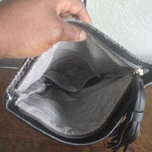 Elevate your style with this chic Jen & Co women's bag. The snake embossed exterior color of black and gray adds a touch of sophistication to any outfit. This crossbody clutch is made of high-quality leather and features a shoulder strap handle style for easy carrying. The bag also comes with removable straps for added versatility.